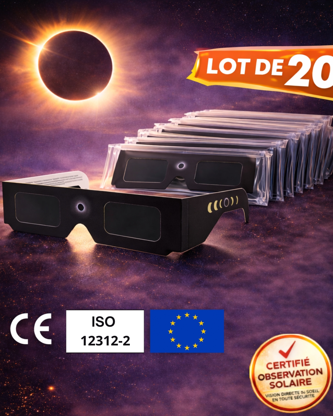 Lunettes pour éclipse solaire – lot de 20 – Certifié CE et ISO