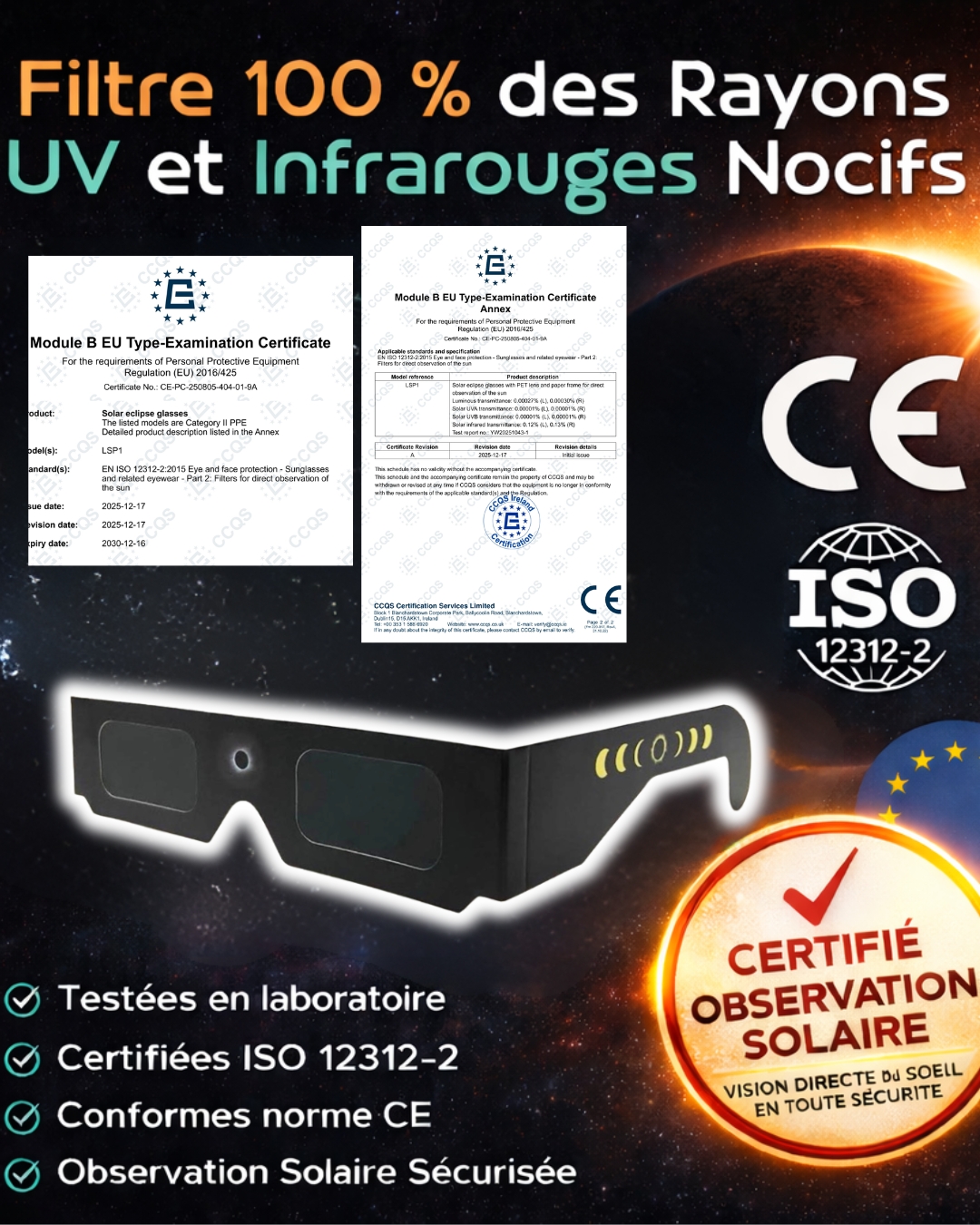 Certifications : Homologation CE européenne et AAS/NASA (garantissant une observation solaire en toute sécurité)